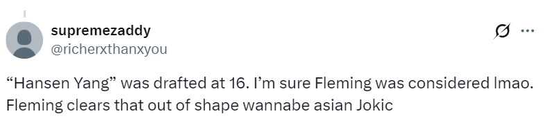 美球迷:杨瀚森第16顺位就被选中了,但我相信太阳的弗莱明一定觉得很滑稽,杨瀚森只是一个空有中国约基奇名头的糟糕家伙。